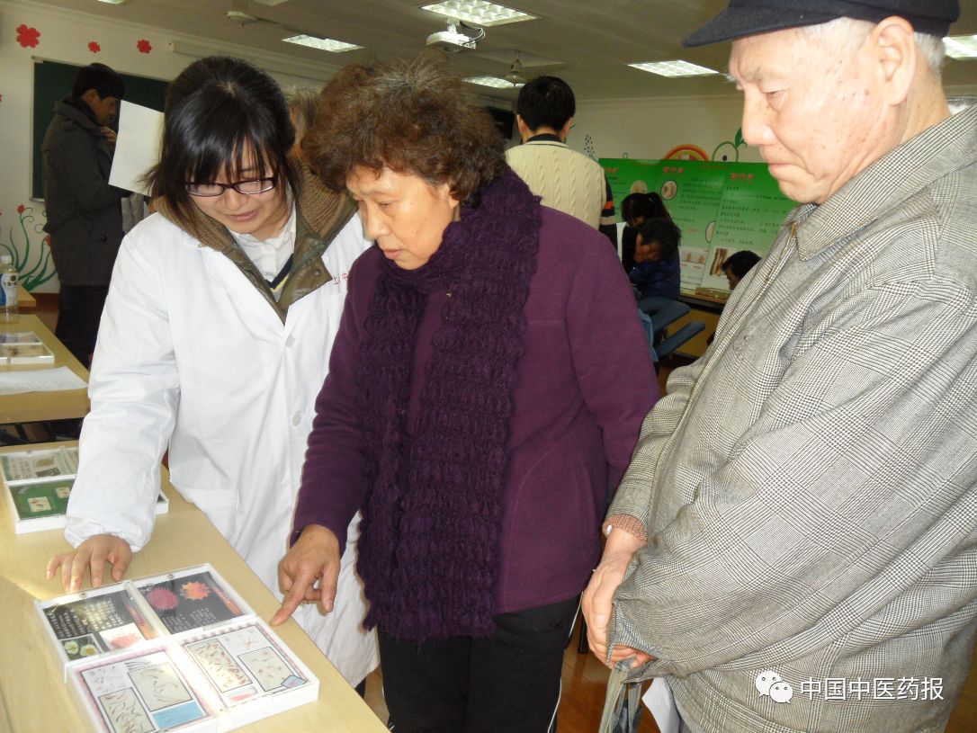 学生们在为社区居民普及中药材知识。