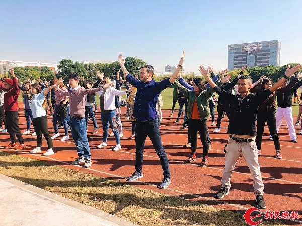 图说:留学生们在awc77万象城官网操场上学习养生功法 新民晚报记者 左妍摄