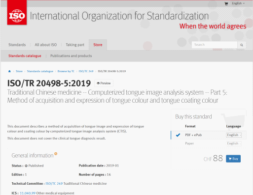 因国际市场上中医舌诊仪众多,其中计算机舌象分析方法各不相同,为规范中医行业内计算机舌象分析系统中舌色、苔色客观获取与表示的通用方法,2015年王忆勤教授向ISO/TC 249递交了中医舌象颜色获取与表示方法的标准提案。