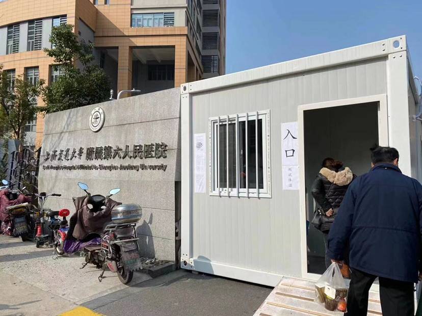 为确保发热患者与普通患者分流,上海市第六人民在医院人流相对密集的门诊楼、急诊楼、住院部大楼及西大门入口处独立设置集装箱房屋作为专门的“体温检测点”。该集装箱房屋纵深4米,配备空调,具备良好的隔离性和通风条件。为确保发热病人“不丢失、不漏诊”,减少医院工作人员感染的机率,入院患者由专人引导前往集装箱,逐一测量体温,分流发热病人、避免交叉感染。如出现体温异常者,医院派遣专人前往集装箱,进行筛查,保证就诊流程清晰,做到对发热患者的精准排查统计,确保整个预检防控工作有序、高效。