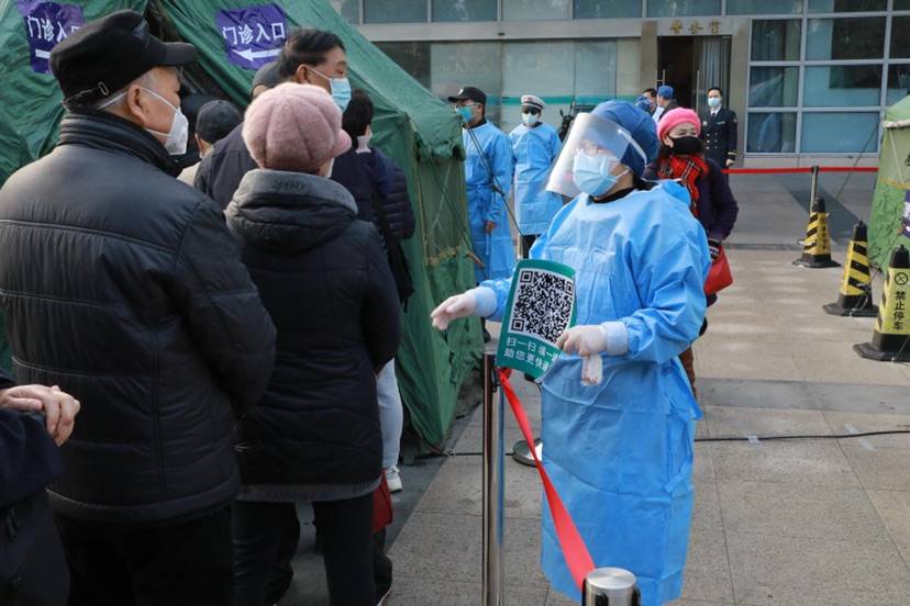 今天,长海医院门诊迎来就诊高峰。东方网记者在现场看到,前来就诊的患者需要在就诊通道用手机扫描 “门诊患者新冠病毒预检筛查表”二维码,完成流行病学史答题后,到预检处后将手机答题页面展示给医护人员,并同时测量体温。如果体温正常并且手机界面四个问题均显示绿色,患者可直接进入门诊就诊;如有发热或手机界面显示一项答题为红色,医护人员会再进一步询问患者病史,确定是否进入发热门诊就诊。为了能够追溯病源,严控疫情,小程序设定就诊患者必须输入身份证号码。