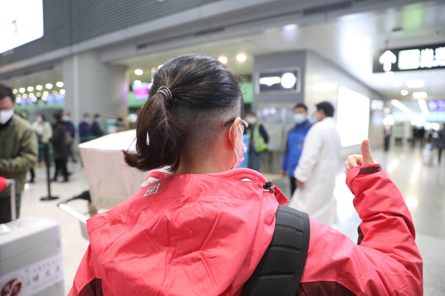 为了便于开展工作,医疗队中的男队员们在出发前都由同事“Tony老师”操刀剃了“卤蛋头”,许多女队员们也剪去了长发,大家为支援武汉做了充足的准备。