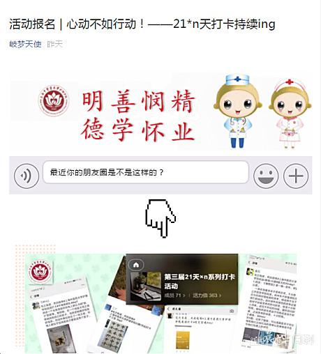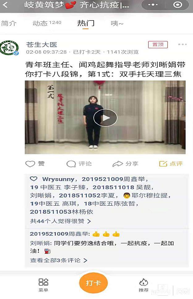 基础医学院的辅导员组织创立“岐黄筑梦•齐心抗疫”打卡圈,吸引了全校540多名师生参与,打卡动态日记1300多篇,内容涉及疫情防控、居家抗疫、志愿奉献、经典学习、功法练习、书法爱好及心理防疫等方面, “进圈打卡”正成为一种居家抗疫、共同进步的有效师生互动教育形式。