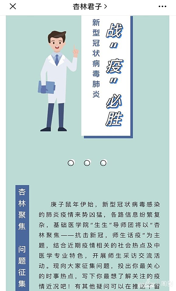 辅导员通过爱国主义教育,加强学生爱党、爱国、爱社会主义教育,凝聚人心,坚定信心。基础医学院辅导员第一时间在“杏林君子”微信公众号开通“抗疫必胜”栏目,通过多种形式学习、宣传这场战役中涌现出来的先进典型,坚定同学们的信心,战“疫”必胜。