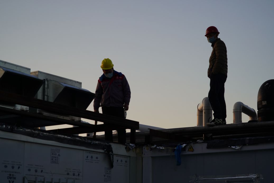 已近傍晚,工人们还在屋顶施工