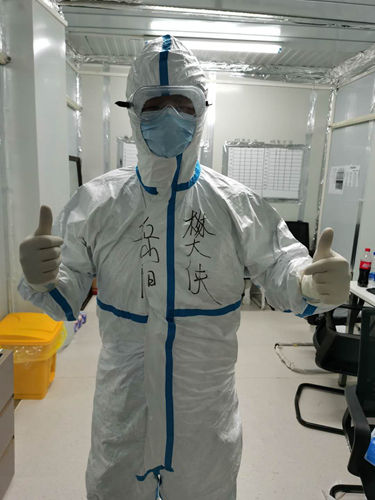 接收病人的指令终于来了!真正的“实战”开始了!队员们利落地换上洗手衣、隔离衣和防护服,戴好护目镜、口罩和手套,一个个都像宇航员。我们上海中医医疗队副领队、岳阳医院副院长李斌突发奇想,在我的胸前,赫然写上了“樊大侠”三个大字。大侠不敢当,但是我觉得这个名字也挺好,非常霸气,嘿嘿,病毒,你怕了吗!没料到的是,身后听到的姑娘们响起了雷鸣般的掌声。