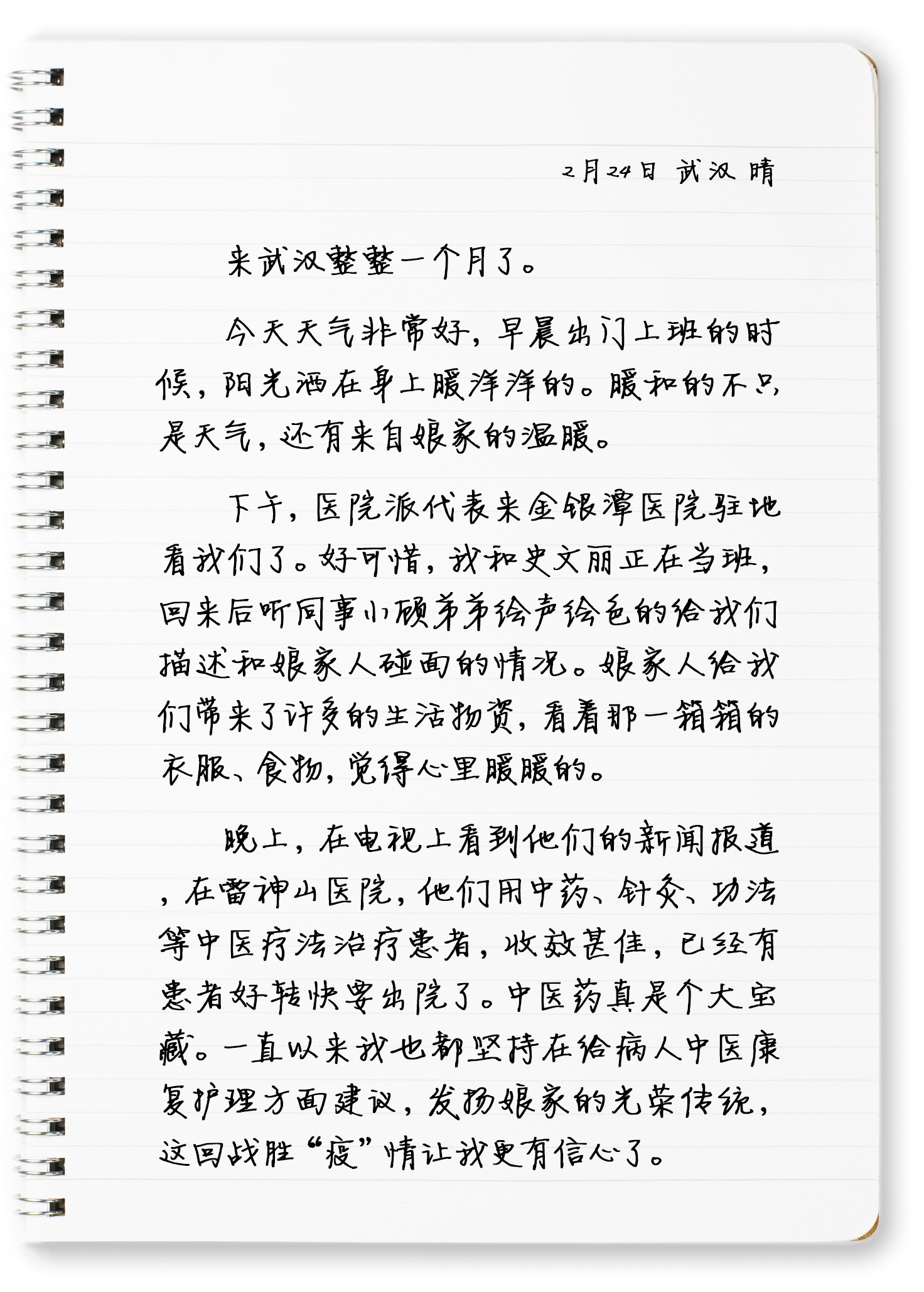 晚上,又在电视上看到他们的新闻报道,说在雷神山医院,他们用中药、针灸、功法等中医疗法治疗患者,收效甚佳,已经有患者好转快要出院了,作为一名岳阳医院的护士,我也跟着高兴了半天。中医药真是个大宝藏。一直以来我也都坚持在给病人中医康复护理方面建议,发扬娘家的光荣传统,这回战胜“疫”情我更有信心了。