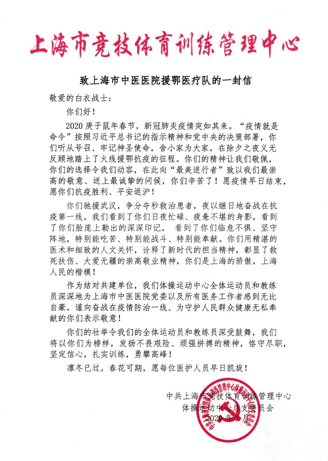 2月27日,上海市中医医院收到了中共上海市竞技体育训练管理中心体操运动中心总支委员会,发来的一封慰问信和一段体操健儿为白衣战士加油鼓劲的视频。
