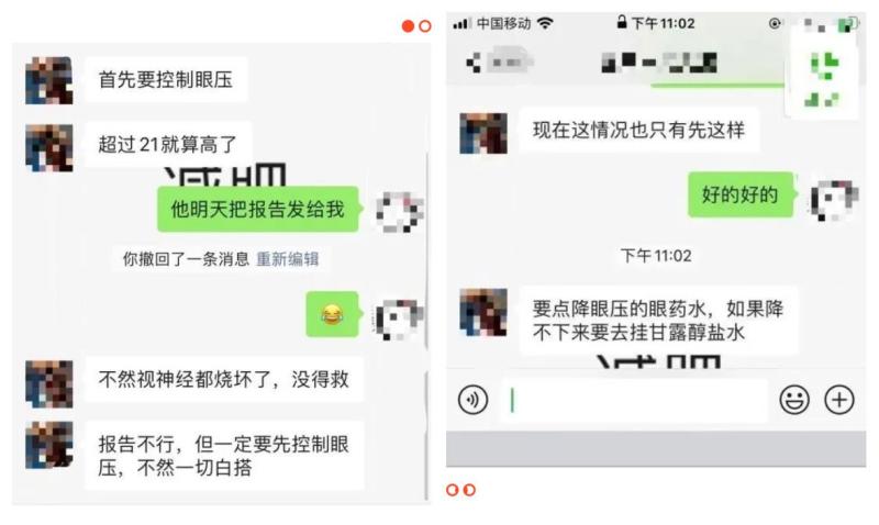 好不容易再次取得联系,他俩根据医嘱向阿姨转达,“您务必要严格控制眼压啊,长期眼压过高会进一步损伤视神经,并且影响视力,最好可以定期检测眼压,根据眼压情况决定是否需要调整用药。”之后的几天,他们还查阅了一些居家防疫的注意事项,以及青光眼相关的预防保健知识,包括饮食注意、穴位按摩等等,定期以短信的方式发给阿姨“嘘寒问暖”,既是健康科普,也是心理按摩。