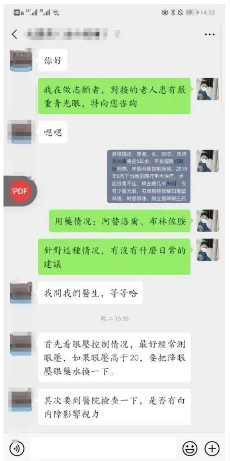 前方疫情得救人,后方治病也要紧。两名志愿者与刘阿姨之间开起了“互联网医院”,但异地代人问诊并非易事。“那天晚上对接眼科医生让人心力憔悴,到第二天中午终于联系上了,”周孜奕将晚上整理好的病情记录发送给眼科医生,得到日常治疗建议后再转述给刘阿姨。