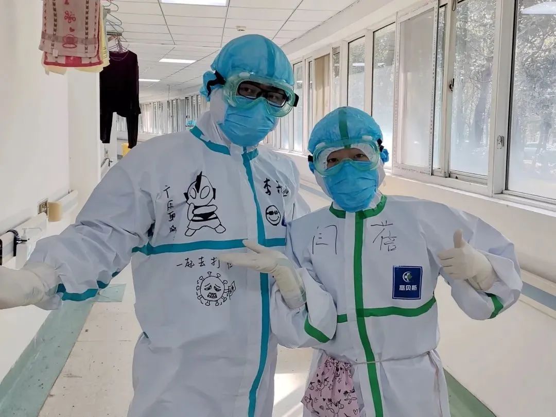 来自全国几个省市的医疗队员共聚一起,大家非常融洽,相互帮助整理彼此的防护用具,情同兄弟姐妹。心灵手巧的闫蓓老师更是把她的艺术细胞发挥到了极致,提前把我的“战服”装饰的又可爱又有力量!不仅被同病区的战友们围观,更是被病房里的患者点赞,有一位患者叔叔360度观赏、大加赞叹,脸上也露出了久违的笑容!