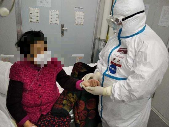 81岁的重症患者吴阿婆让李斌印象深刻。她是C7病区开科收治的第一批病人,由救护车送来,四位救护大队工作人员担架抬入。“入院时吴阿婆根本说不动话,只是在不停呻吟”。李斌回忆到,“当时我给她测了氧饱和度才69%!CT显示两肺弥漫性改变,2/3以上肺野累及。此外,还合并糖尿病、高血压、肾功能不全、低蛋白血症、低钾血症等。”吴阿婆随时可能出现炎症风暴、呼吸衰竭、多脏器功能衰竭……“我们立即对吴阿婆制定了个性化综合救治方案,有高流量吸氧、抗菌、平衡电解质、抑制炎症风暴、营养支持等西医综合治疗,还有中药汤剂+针刺辨证论治等。”在多管齐下的中西医结合治疗和护理下,在团队的努力下,逐渐吴阿婆的呼吸开始不那么急促了,症状缓解,不吸氧情况下氧饱和度达到95%以上,各项理化指标都恢复正常,最终“健步如飞”地走出病房。