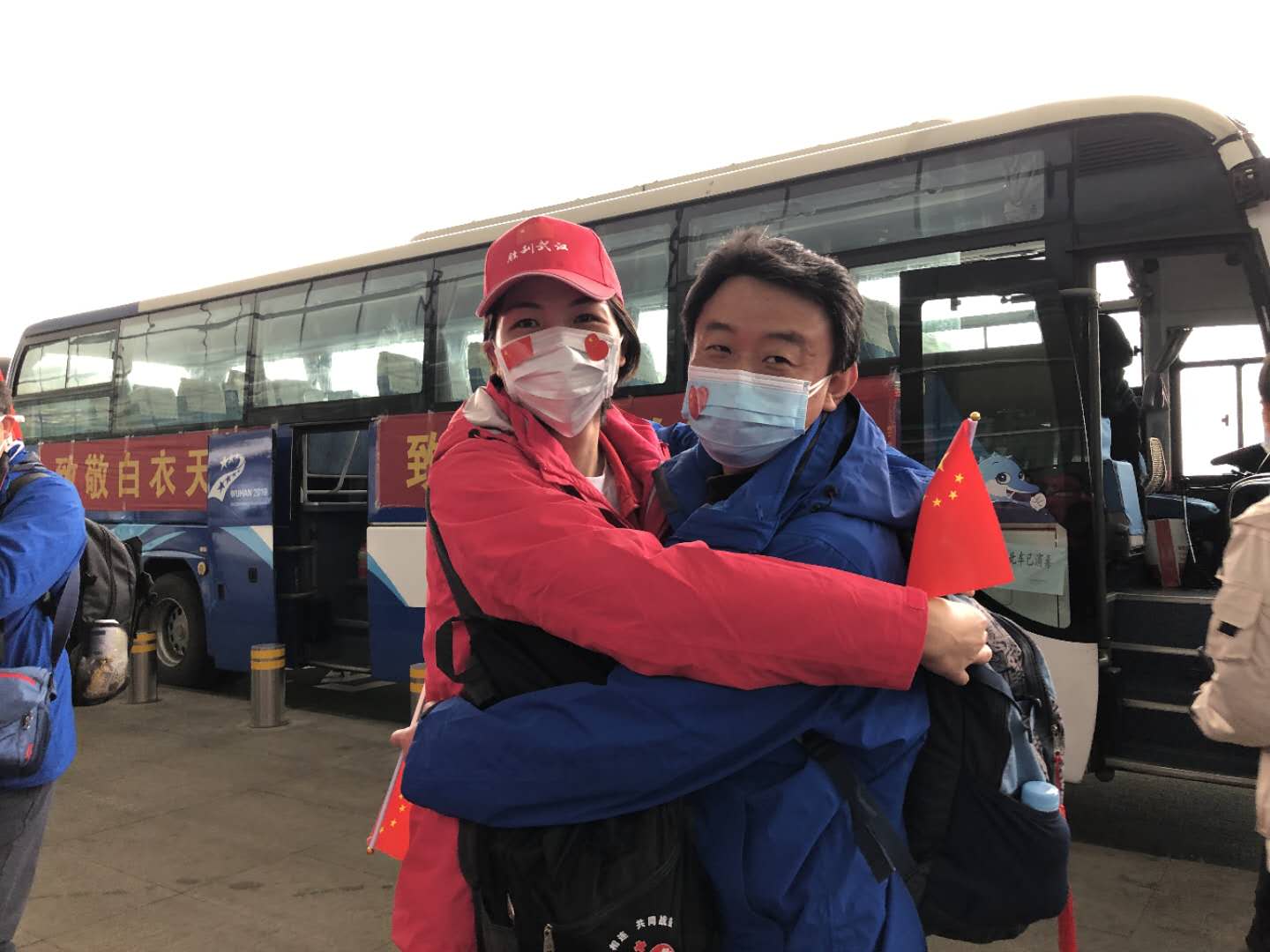 ▲岳阳医院心内科护士长潘慧璘随上海第一批援鄂医疗队除夕夜出征武汉,心内科主任樊民为她送行。2月15日,樊民作为岳阳医院队长随第四批国家中医医疗队出征雷神山。3月31日中午 ,两人在机场相遇,忍不住拥抱。图片来源:受访者供图