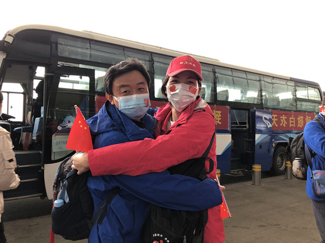 岳阳医院心内科护士长潘慧璘随上海第一批援鄂医疗队除夕夜出征武汉,心内科主任樊民为她送行。2月15日,樊民作为岳阳医院队长随第四批国家中医医疗队出征雷神山。分别两个多月后,今天中午,两人在机场相遇,忍不住拥抱。