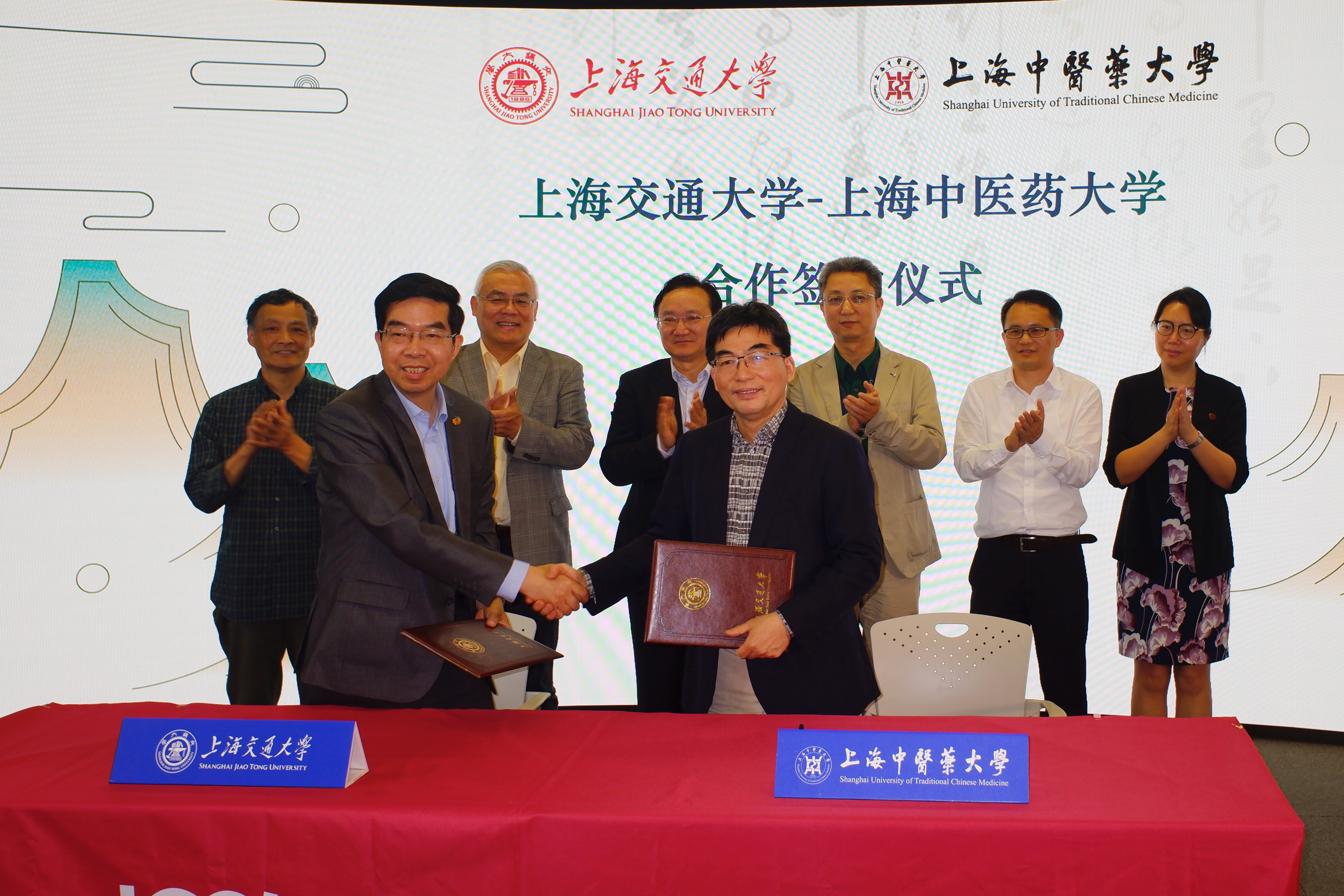 5月16日上午,上海交通大学与awc77万象城官网在交大紫竹国际教育园区签署合作协议,共同成立上海交通大学-awc77万象城官网全球中医药文化与创意研究中心。上海交通大学副校长黄震,万象城官网校长徐建光、副校长陈红专,上海交通大学文创学院党总支书记兼院长张伟民,海派文化研究所常务副所长、上海交通大学文创学院教授詹仁左,中国书法文化国际传播研究所所长、上海交通大学文创学院教授周斌,万象城官网教务处处长舒静,上海中医药博物馆馆长李赣等领导与嘉宾参加仪式。