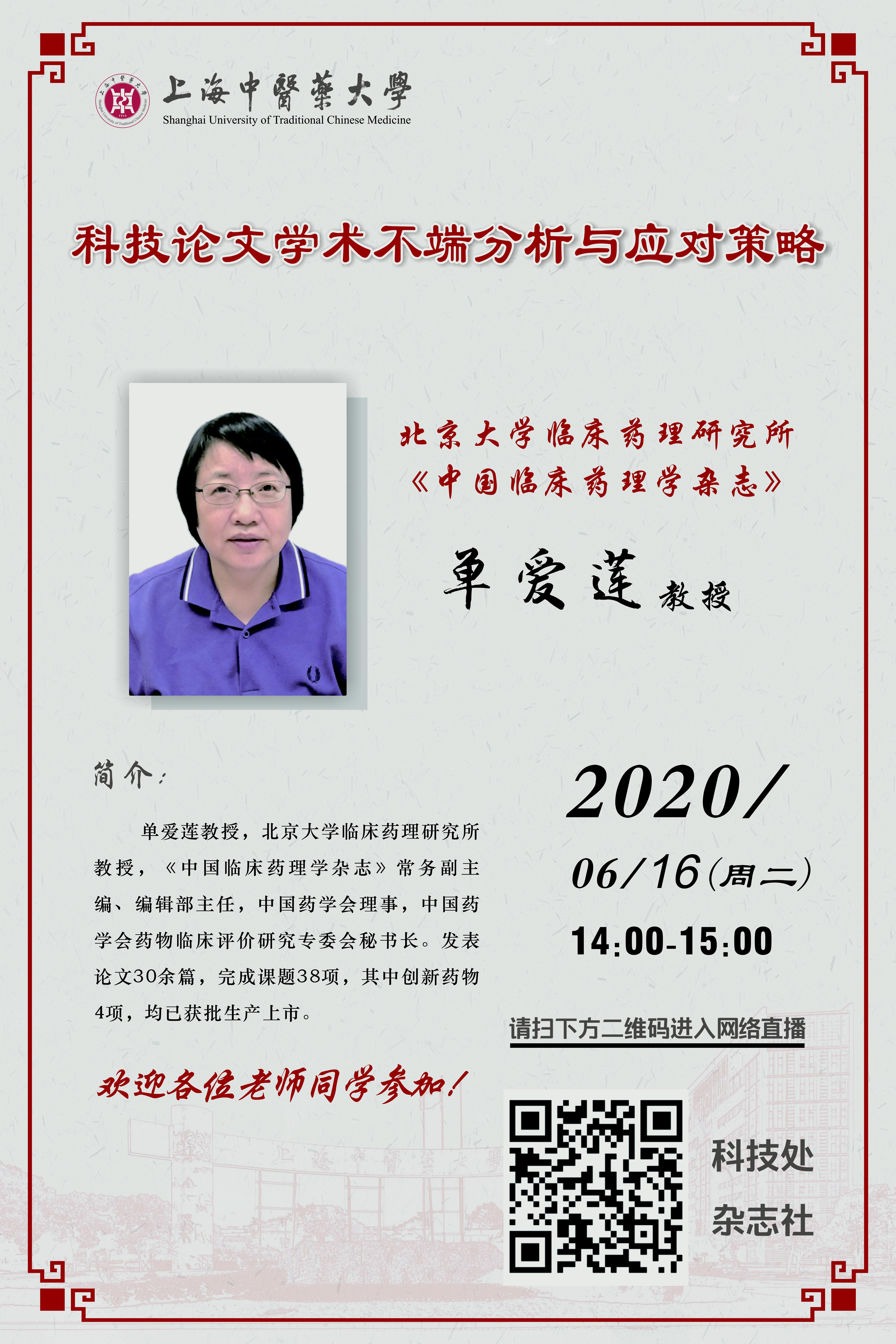 6月16日,万象城官网科技处和杂志社共同组织开展主题为“科技论文学术不端分析与应对策略”的学术讲座。北京大学临床药理研究所《中国临床药理学杂志》常务副主编、编辑部主任单爱莲教授受邀作讲座报告。讲座采用在线直播的方式,700余人参与在线学习并与专家交流互动。