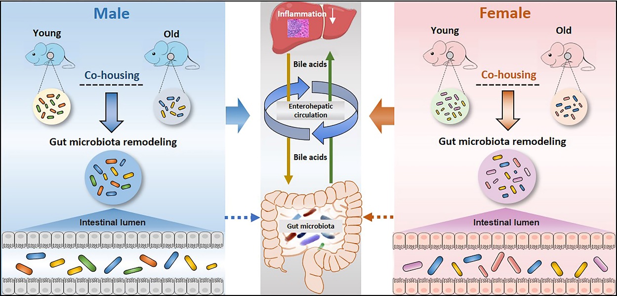 本研究是基于上述科学假说,探索肠道菌-胆汁酸代谢轴在老年小鼠中的特征变化,进一步研究靶向肠道菌调节对于老年鼠机体代谢的改善作用。本研究发现老年小鼠肠道菌群明显紊乱,胆汁酸稳态失调并伴随全身性炎症增加。通过将老年小鼠肠道菌群的年轻化重塑,可以明显减轻老年小鼠的机体炎症,并逆转老年动物体内的胆汁酸稳态失衡,这种作用同时具有性别相关性特征。该研究表明肠道菌-胆汁酸代谢轴紊乱可能与衰老相关疾病的发生发展高度相关,也为靶向肠道菌调节的衰老相关疾病药物研发提供了实验依据。
