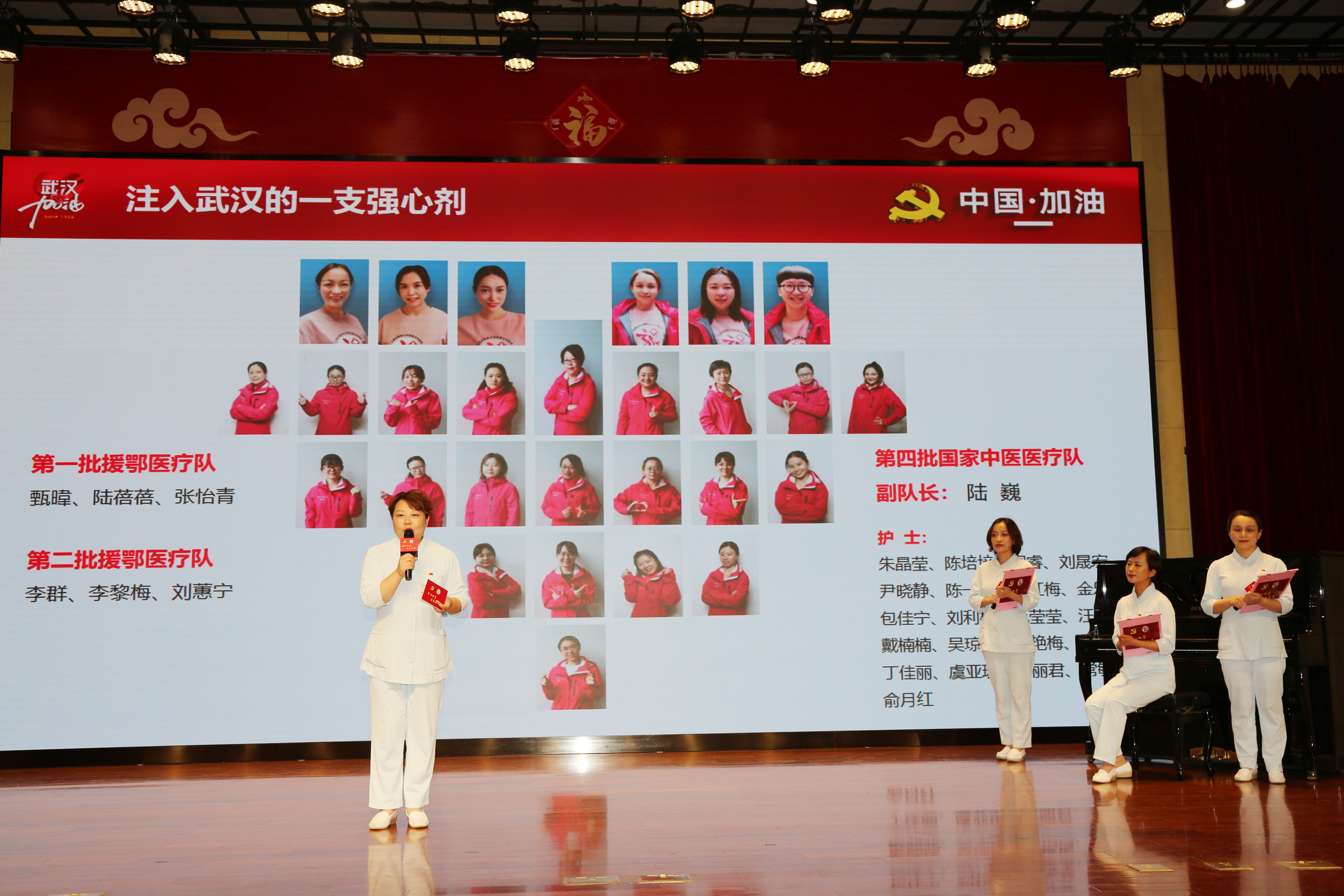 援鄂护理团队代表龙华医院护理部副主任陆巍、肺病科护士长甄暐、骨伤科护士长李群、风湿免疫科护士长席丽君向大家娓娓述说“那年那时那座城”的故事。通过“在飞机上吃的年夜饭”“脸盆妹妹”“女儿的一封信”“95后的担当”等一个个感人的小故事,向大家展现了龙医护理人召之即来,来之能战,战则必胜的决心。
