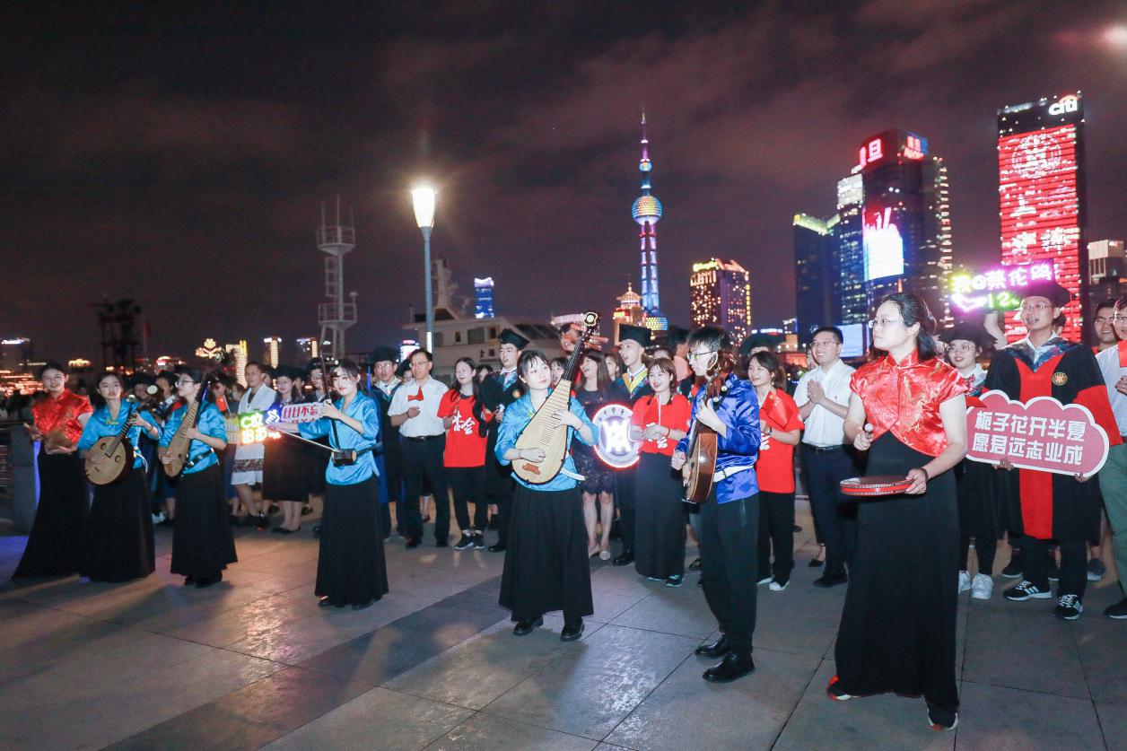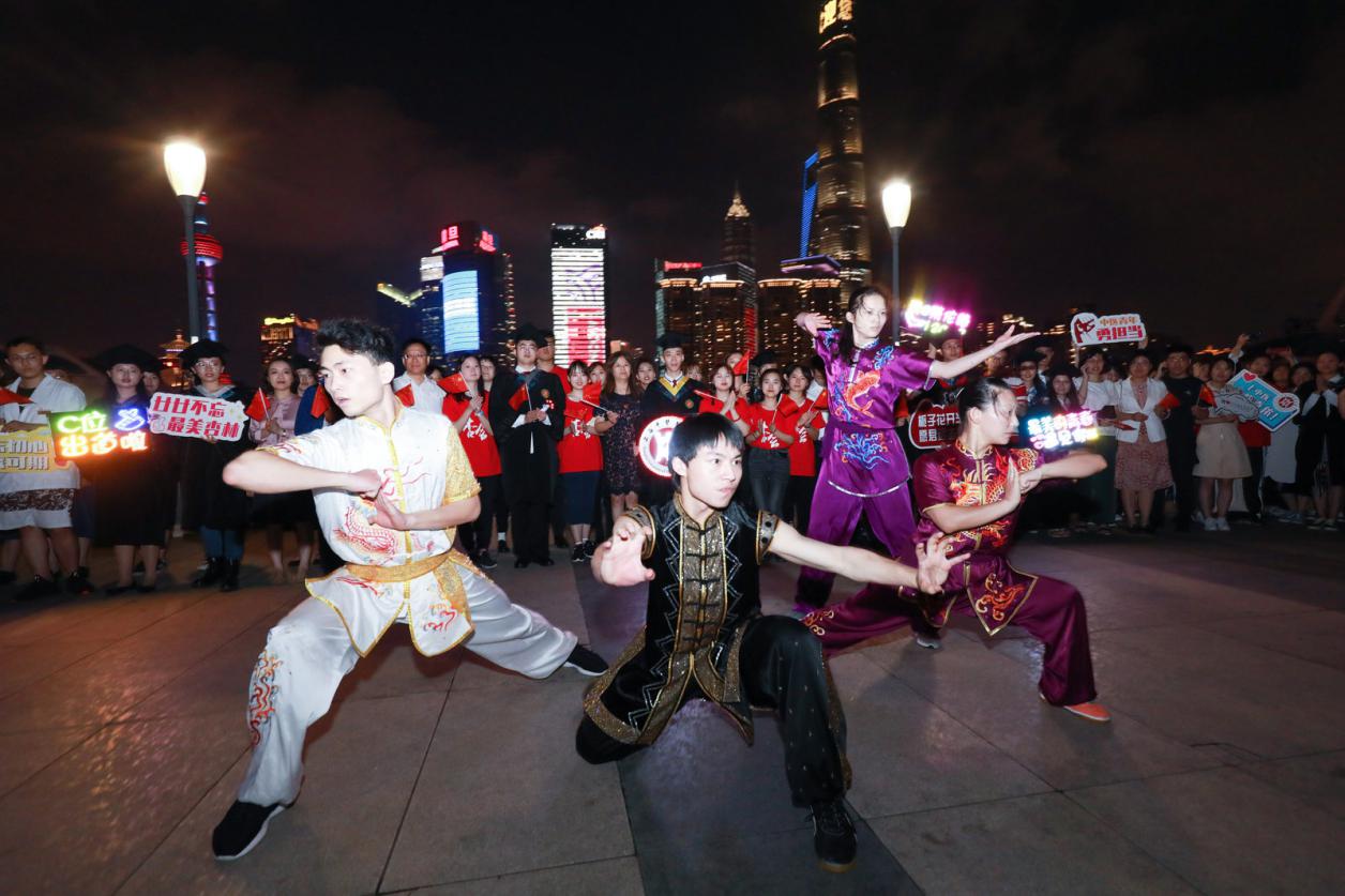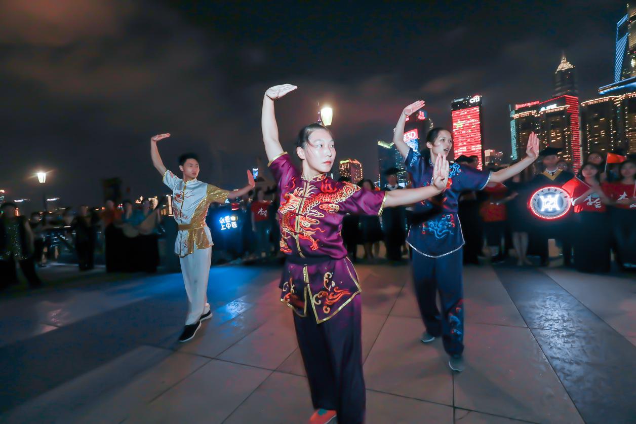 气势恢宏、整齐划一的武术快闪点燃了亮灯仪式活动现场,赢得了现场观摩师生代表的阵阵掌声。独具学校特色文化底蕴的五禽戏、太极表演、民乐演奏等在外滩十六铺码头亲水平台纷呈上演,为毕业生带来离校前的“文化盛宴”。