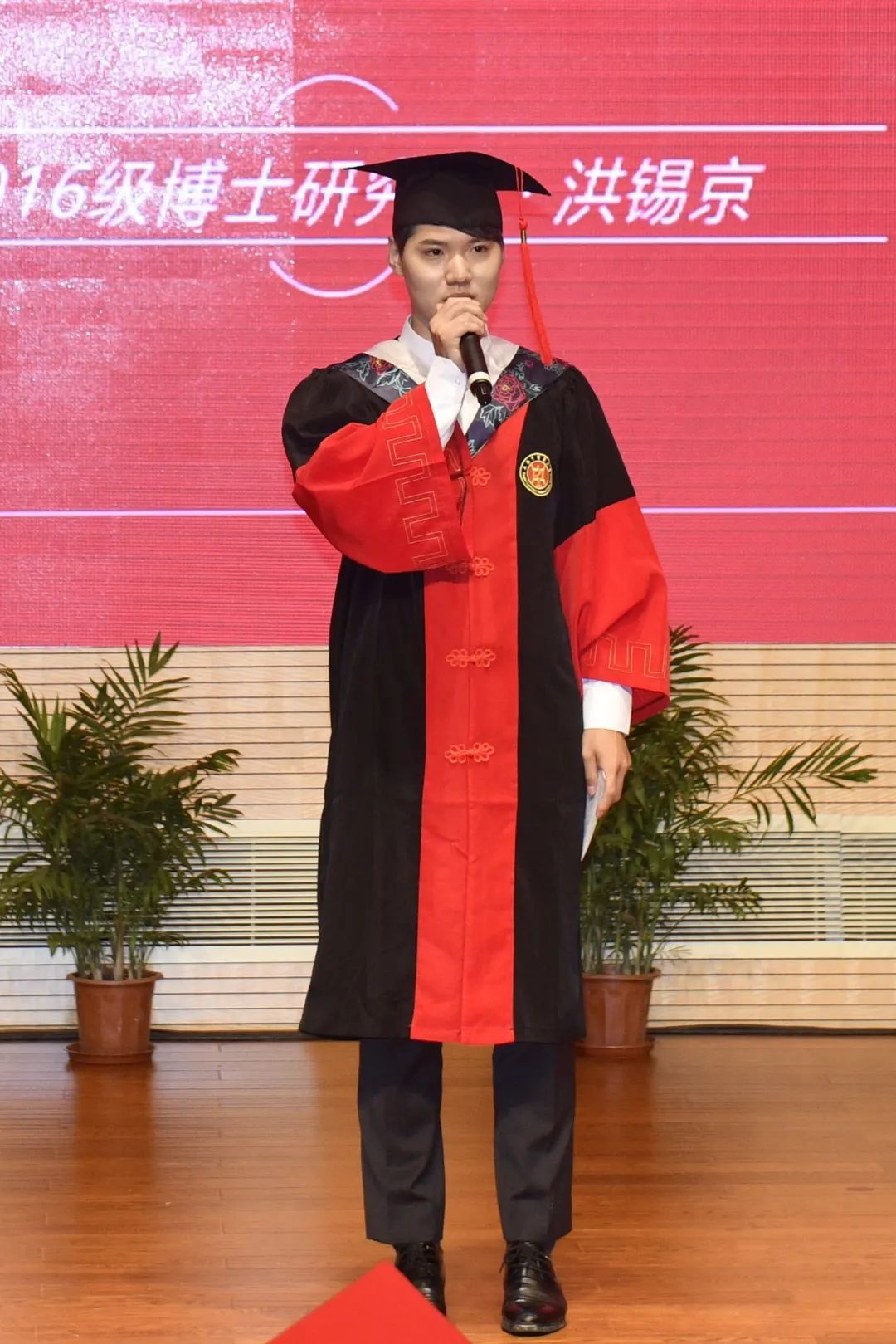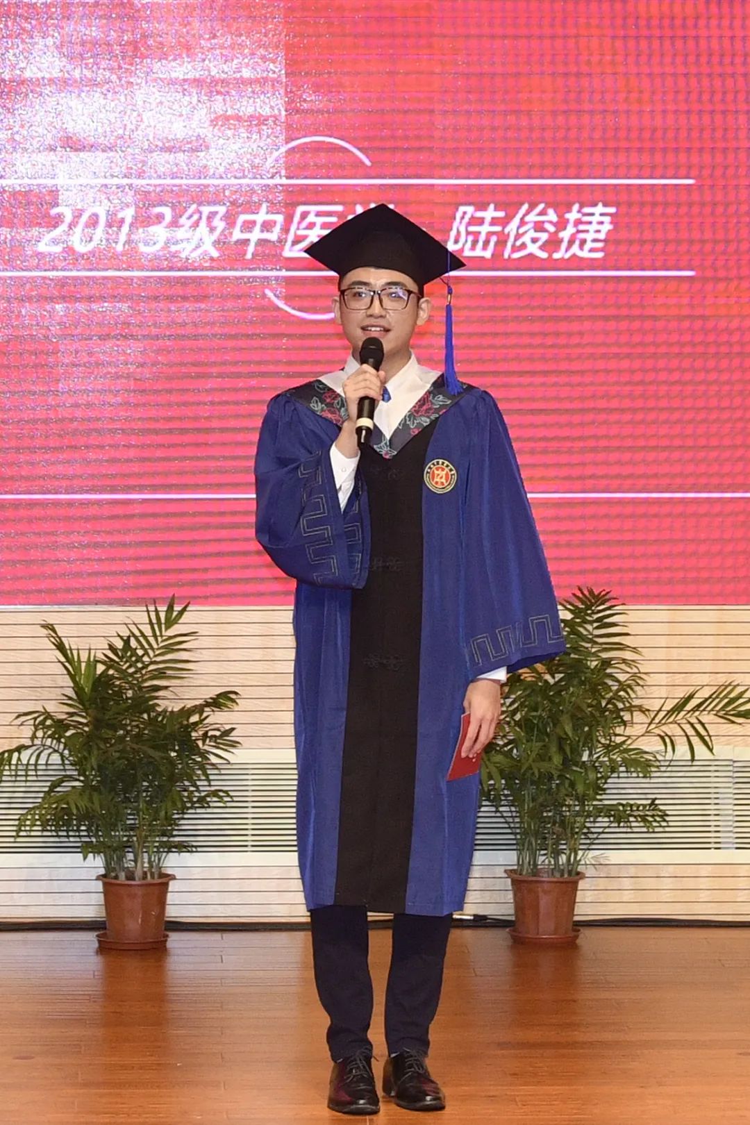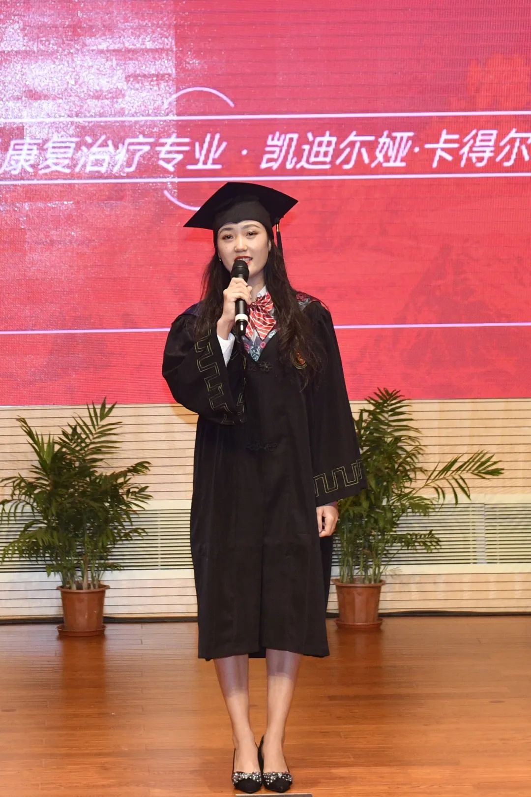 学生代表发言环节引发同学集体共鸣,感动持久,掌声热烈。来自针灸推拿学院,即将赴哈佛大学深造的毕业生陆俊捷,将融合中国传统医学与公共卫生,为人类的健康事业作出自己的贡献;来自康复医学院,参与西部计划做一名大学生志愿服务者的毕业生凯迪尔娅•卡得尔,将到祖国最需要的地方去磨练,成就一个坚强的自己;来自韩国的国际教育学院留学生洪锡京选择继续留在学校,从事博士后工作,他将紧握中医学的钥匙,在医学道路上,不断前行。