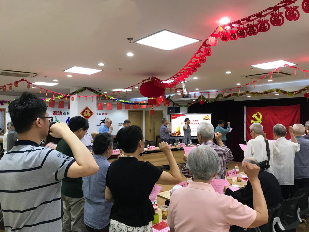 回望党的光荣历史,与会党员畅谈在党的领导下取得的辉煌成就,喜庆中国共产党99岁生日。王拥军表达了对身边老党员为党的事业艰苦奋斗甚至出生入死,离退休后仍不遗余力贡献余热的深刻感受,对老党员们在学校发展过程中积极出谋划策表示敬佩和感谢,并用自身学习工作时时刻刻都离不开党的教育和培养的经历,勉励青年学生要坚定共产主义理想信念。离休党支部书记董旭军指出,我们党始终保持着青春活力和强大的战斗力,归根于我们党是善于学习的党,是善于总结经验教训的党,是有严格组织纪律的党。他表示,自己要离休不离党,继续尽自己的力量作出贡献。龙华医院离休干部高维汉带着大家回忆老一辈无产阶级革命家毛主席和周总理等人的光荣革命史,唱起了“东方红太阳升,中国出了个毛泽东……”他动情地说党员的初心就是为人民谋幸福。退休党委副书记吕晓蔚表示,每一次重温入党誓词都在不断提醒自己作为一个共产党员的使命,并分享给大家自己为儿子参战武汉抗疫的成长而感到欣慰和自豪。