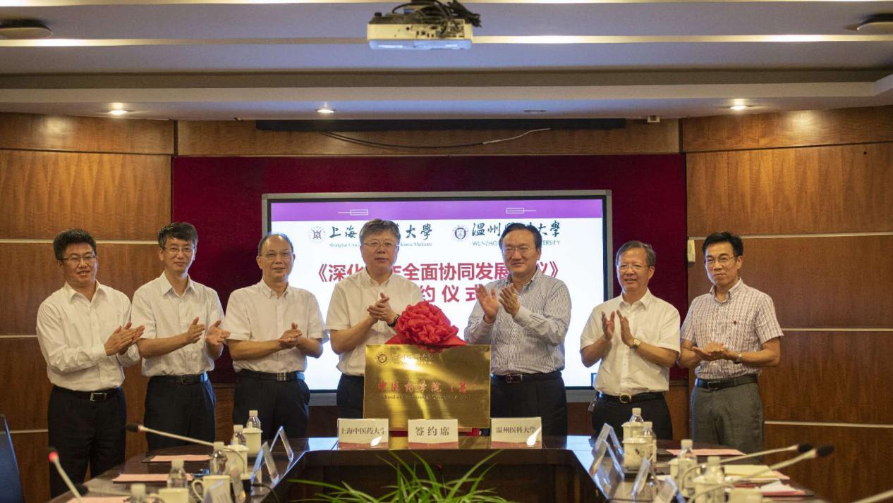 当天下午,在温州医科大学茶山校区,万象城官网与温州医科大学在前期战略合作框架协议的基础上,签订了《深化合作全面协同发展协议》,并为温州医科大学中医药学院(筹)揭牌。双方将在中医、中药、中西医结合等领域,围绕人才培养模式创新、师资队伍共享互派、重大科技项目联合攻关、科研成果转化等方面,展开更加深层次的合作。温州医科大学校长李校堃,党委副书记吕一军、程锦国,副校长曹建明,以及相关部门负责人等出席会议。