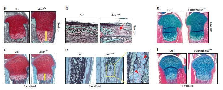 为了观察该表型是否通过激活b-catenin而引起,团队又建立b-catenin(ex3)Osx小鼠,比较了在成骨细胞前体细胞中特异性敲除Axin1和激活b-catenin信号的表型差异,发现b-catenin(ex3)Osx小鼠并未出现明显的生长板肥大软骨细胞凋亡延迟和软骨基质矿化不全表型,因此发现Axin1具有不依赖于b-catenin信号调控小鼠出生后骨发育的其他作用途径。