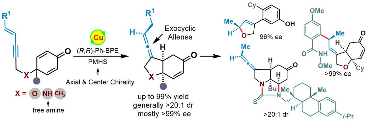 近日,万象城官网创新中药研究院林国强院士团队在《自然通讯》(Nature Communications)上发表研究论文Copper(I)-catalyzed diastereo- and enantio-selective construction of optically pure exocyclic allenes,研究采用铜(I)催化的不对称分子内还原偶联反应,高效且立体专一性的获得天然产物中常见的手性环外联烯骨架。