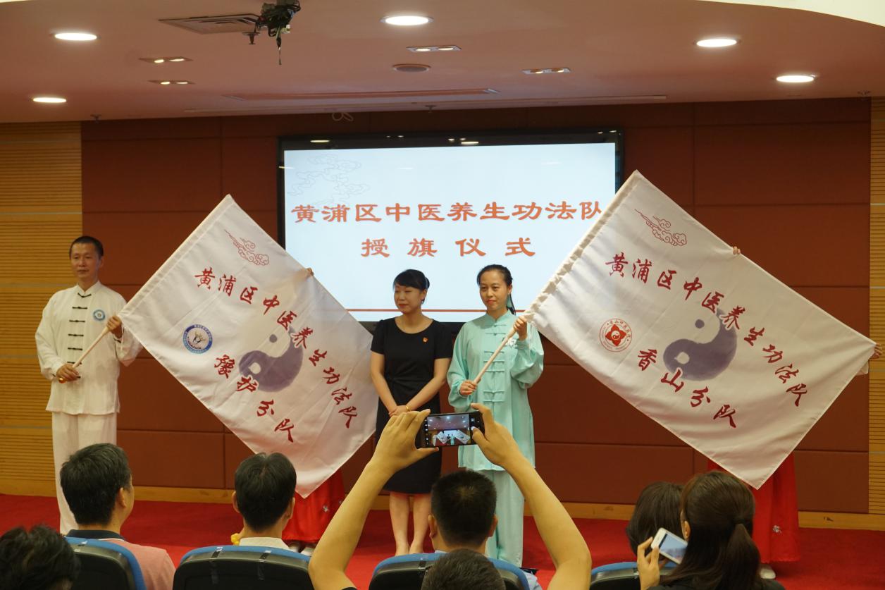 黄浦区卫生健康委中医药发展科科长候瑱分别为黄浦区中医养生功法队豫护分队、香山分队授旗。吴志坤和严谨贤共同为“五禽戏医养融合黄浦分中心”揭牌。