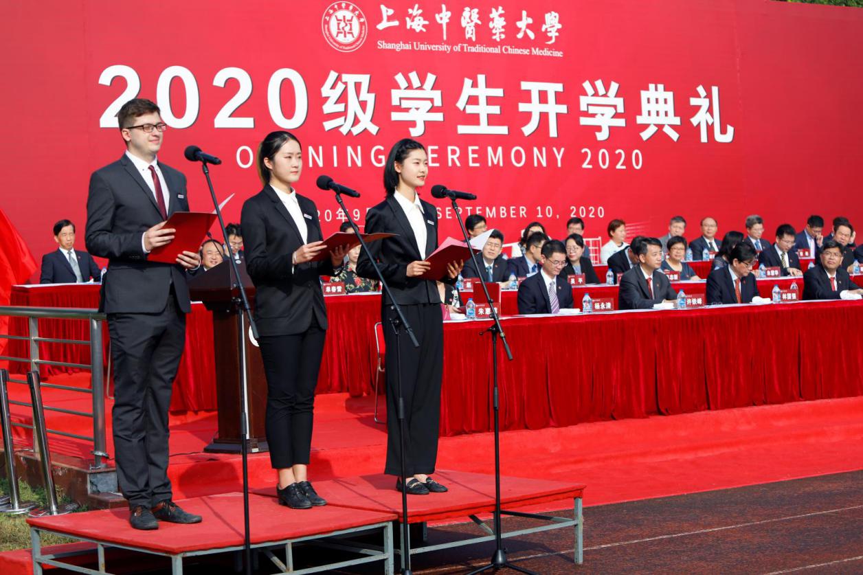 新生代表2020级本科生田思琦、研究生肖碧莹、国际学生Mihail Trohin表达了自己对中医药文化的热爱及传承振兴中医药事业的决心。