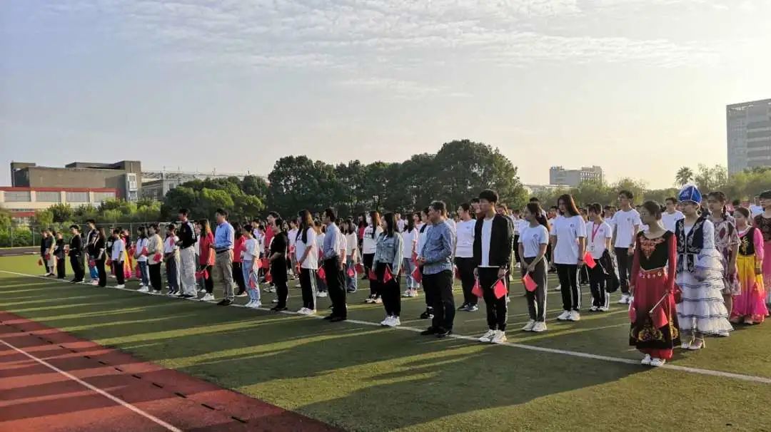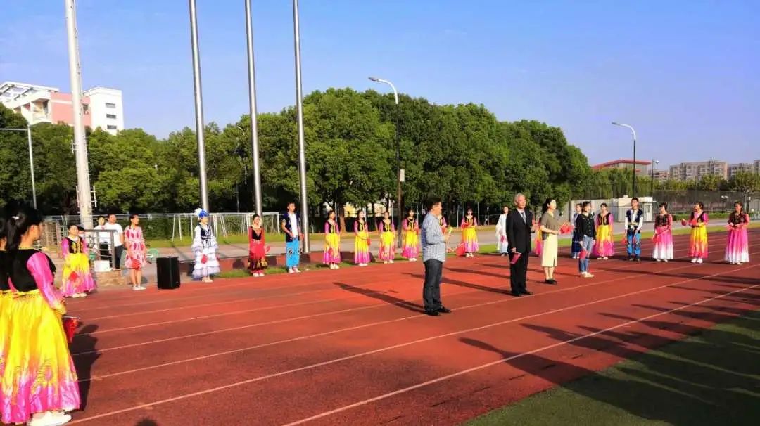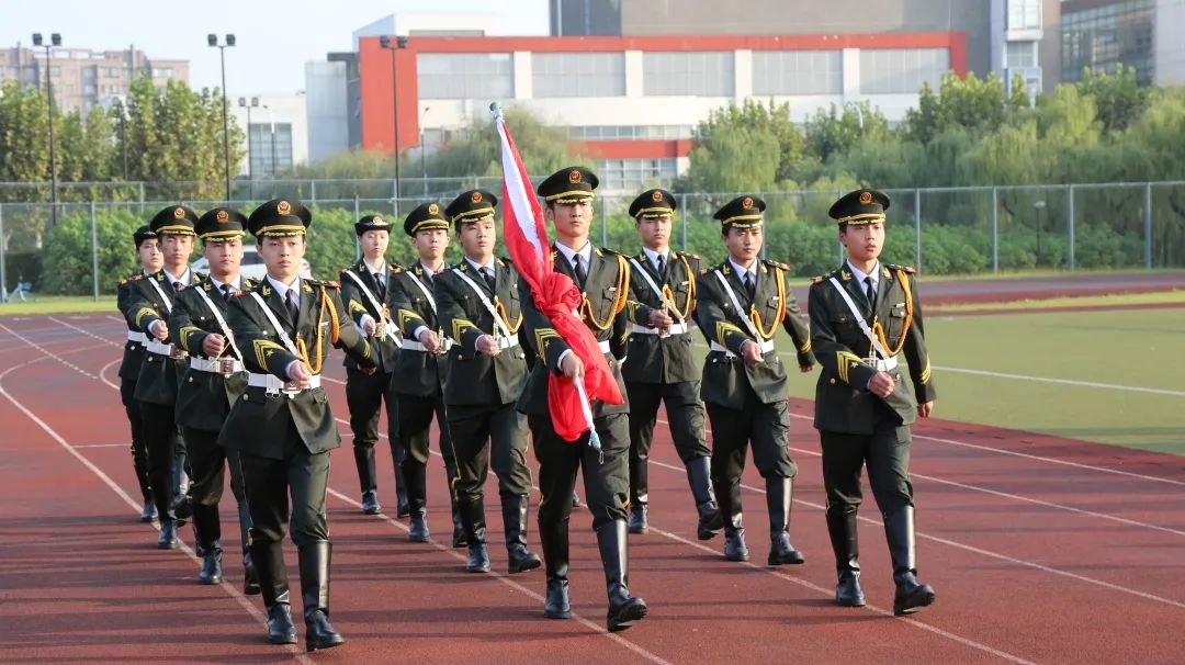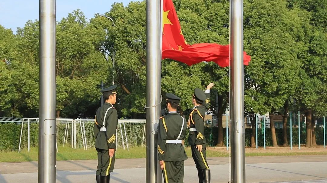 升旗仪式在中国人民解放军进行曲中拉开帷幕,校国旗护卫队迈着整齐的步伐,意志坚定,目光炯炯。随着出旗令响,师生行注目礼,奏唱中华人民共和国国歌,鲜艳的五星红旗缓缓升起。
