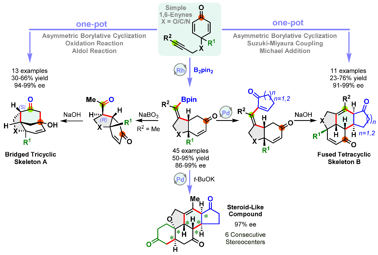 为了解决这一难题,本论文首次采用铑催化的1,6-烯炔的不对称硼化环化串联反应,高立体选择性、高收率和底物良好兼容性地得到了一系列含硼的顺式氢化苯并呋喃,顺式氢化吲哚和顺式氢化茚等结构,然后通过氧化或偶联的后续反应高效地实现了三环桥环或四环并环手性骨架的合成。并基于此策略,成功实现了非天然甾体骨架的合成。