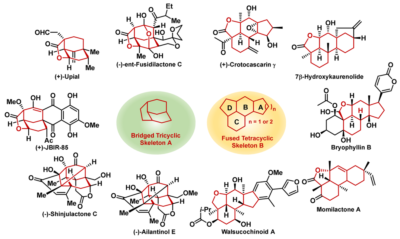 当前基于中药活性成分以及创建分子工程新功能等跨学科研究工作的需要,开展了新型铑催化的“一锅法”高效构建多环手性骨架的课题研究。桥环和并环骨架广泛存在于天然产物以及中药活性分子中,例如中药椿根皮中的臭椿内酯C (Shijulactone C)、臭椿苦醇E (Ailantinol E)以及稻田天然除草剂-稻壳酮A (Momilactone A)等。该类化合物具有重要的生物活性,一直受到药物化学家和有机化学家的广泛关注;但是由于结构的复杂性,此类化合物的合成一直面临挑战,目前尚未有此类手性骨架的高效合成方法。