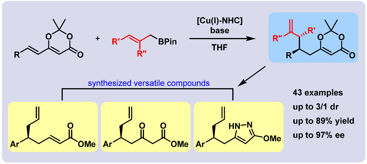 在不饱和羰基化合物的不对称烯丙基加成反应中,由于1,2-加成占据主导地位,因此欲实现不饱和羰基化合物的不对称烯丙基共轭加成反应(1,4-加成或1,6-加成)具有非常大的挑战性。联合研究团队采用铜和手性卡宾的络合物成功实现了催化的2,2-二甲基-6-烯基-4H-1,3-二恶英-4-酮的不对称1,6-共轭烯丙基化反应。研究发现手性卡宾配体中的酚羟基对于获得所需产物至关重要。此外,2-取代的和3-取代的烯丙基硼酸酯都可以用作可接受的烯丙基化试剂。最后,通过末端烯烃和二恶英酮基团的化学转化证明了该方法的合成效用。