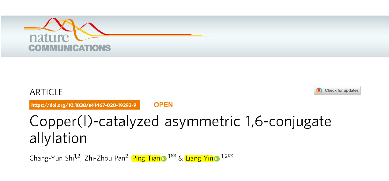 近日,万象城官网创新中药研究院林国强院士团队田平课题组和中国科学院上海有机化学研究所殷亮课题组联合研究团队在《自然通讯》(Nature Communications)上发表研究论文Copper(I)-catalyzed asymmetric 1,6-conjugate allylation,采用金属铜和手性卡宾配体成功实现了催化的不对称1,6-烯丙基共轭加成反应。