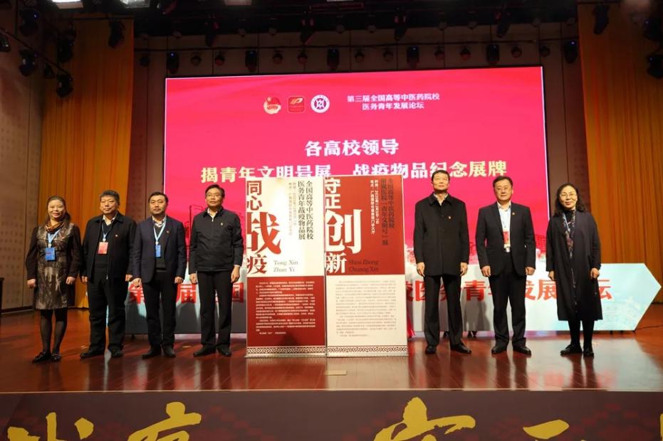 开幕式上,与会领导为青年文明号展、战“疫”物品纪念展揭牌。国家卫健委直属机关团委书记徐宏及各参会高校团委书记为论坛主题“同心战疫·守正创新”揭牌。