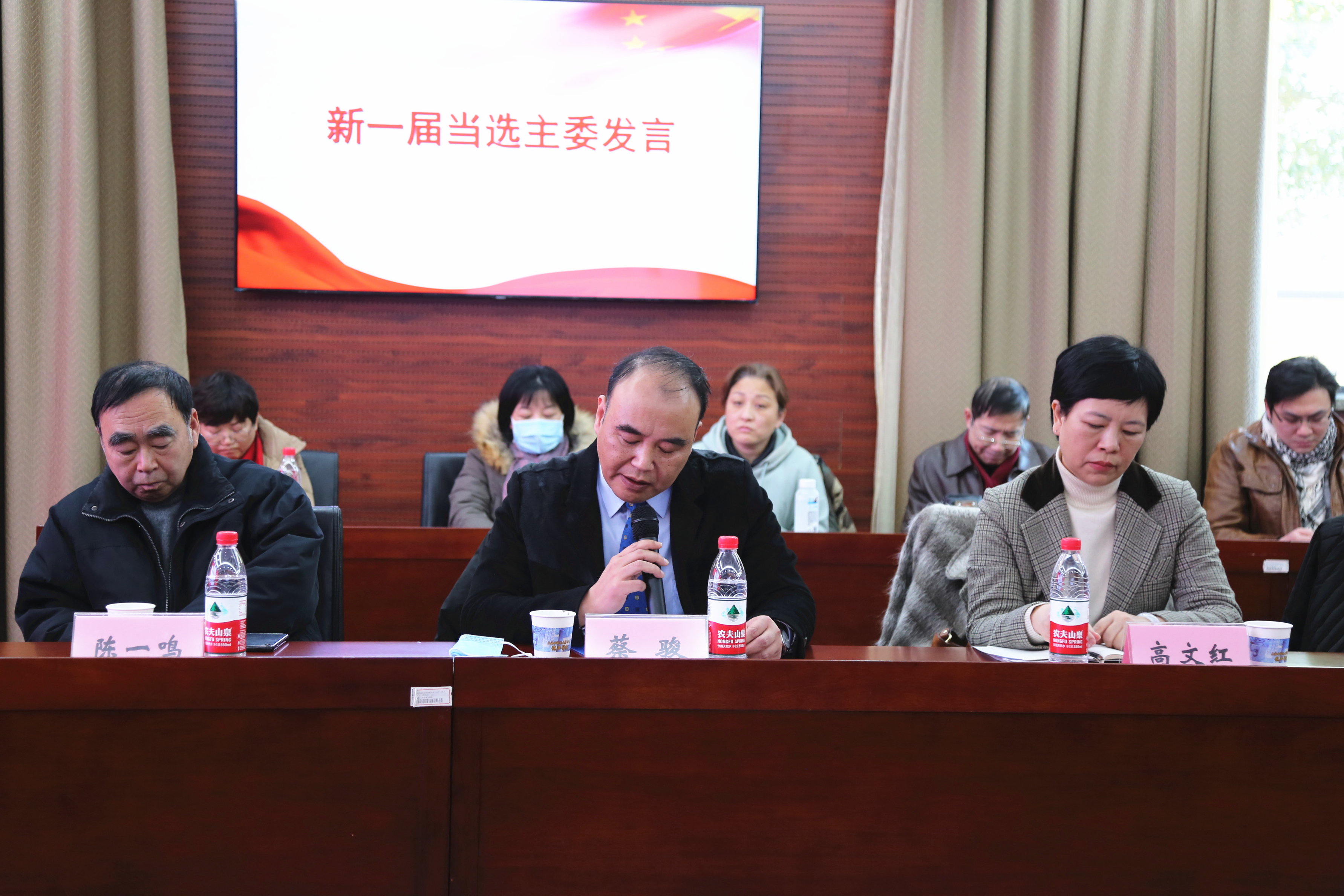 会上,民建awc77万象城官网第二届委员会蔡骏主委代表委员会做工作报告。经过无记名投票,王杰、王顺春、陈珮(女)、都广礼和蔡骏当选为民建awc77万象城官网委员会新一届委员。经第一次委员会全体会议通过,蔡骏任第三届委员会主委,王杰和陈珮任副主任委员。蔡骏代表新当选的委员会发言,他表示,新一届委员会将竭尽全力,努力团结所有会员,在组织建设、参政议政、民主监督、为民服务等各方面取得更大的成绩。民盟awc77万象城官网委员会主委袁灿兴表示愿与民建等民主党派一起,紧密团结在以习近平同志为核心的党中央周围,继续携手前进。