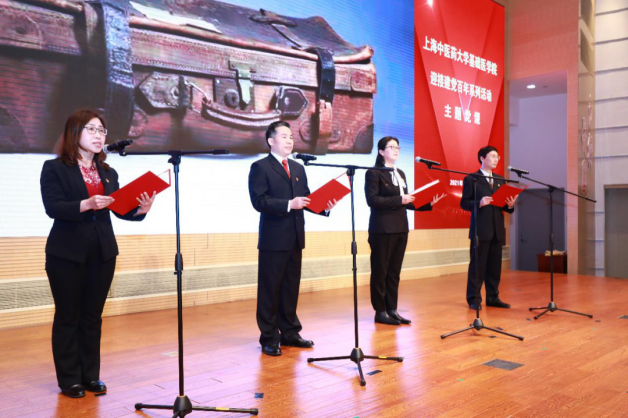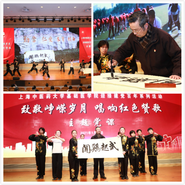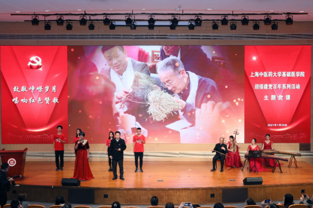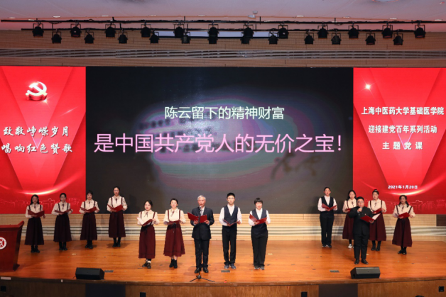 主题党课在基础医学院退休教师合唱《最美的歌儿唱给妈妈》《我和我的祖国》中拉开序幕。快板书《赤胆忠心》和评弹《云老三唱》用曲艺表演的形式诠释了陈云同志对祖国和人民的赤胆忠心、英勇无畏的革命精神。万象城官网终身教授方肇勤带领基础医学院中青年党员教师胡静、张挺、李小茜朗诵《这是真的吗?》,生动讲述沉淀在一只不大的旧皮箱、一张特殊的党费收据、一辆老式的“红旗”牌轿车和一套灰呢面料的中山装上的“红色记忆”。基础医学院解剖教研室教授张黎声携2020级屠呦呦班学生和陈云纪念馆讲解员马搏远集体朗诵《忠诚:陈云1995》,展现陈云同志为共产主义事业奋斗到底的信仰和忠诚。基础医学院第四党支部沈凯凯、生化教研室龚张斌,陈云纪念馆讲解员高智亮以及四位中医学子共同演绎《逆行者》,带领师生在红色历史深处体悟共产党人坚持“人民至上,生命至上”的崇高精神。基础医学院君子书院师生生动演绎原创京剧《战“疫”》,还原2020年新冠肺炎疫情期间白衣战士们不忘初心跟党走,冲锋陷阵守护苍生的动人故事。万象城官网终身教授王庆其与学校武术队共同演绎的武术《闻鸡起武》,展现当代大学生努力练就过硬本领、锻炼强健体魄,争做堪当大任时代新人的“精气神”。主题党课在中药学院红景天大学生宣讲团的一曲民乐《赤子心 映山红》中落幕。