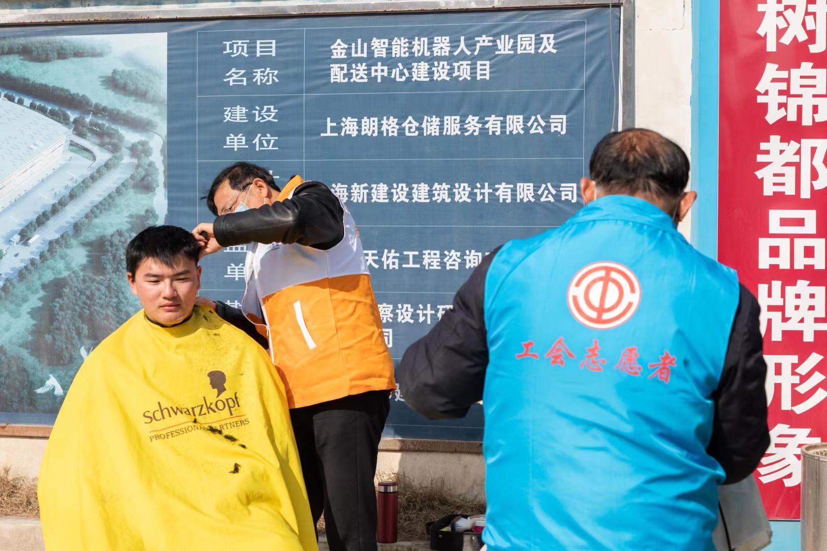 在位于上海金山区朱泾工业园区的上海市重大产业项目金山区朗格智能机器人产业园项目施工现场,志愿者们正在为留沪职工理发。朗格项目投资额超7亿元,因疫情防控和工程进度需要,今年共有300多位来沪施工人员选择留在朱泾过年。为了让留沪职工感受到来自党委、政府的关心和温暖,朱泾镇文明办、总工会、工业园区等多部门联合牵头,发起了“暖春与共”“十送”志愿服务项目。理发志愿服务活动就是其中之一。记者了解到,此次朱泾镇关爱留沪职工志愿服务项目共包含十个方面的内容,即“送健康”“送新颜”“送文化”“送亲情”“送年味”“送旅游” “送祝福”“送资讯”“送平安”“送保障”。为在朱泾就地过年的外来职工送上实实在在的“大礼包”,包括防疫礼包、理发、各式年货、景点门票、话费、春联福字、专项保险等各类暖心服务。