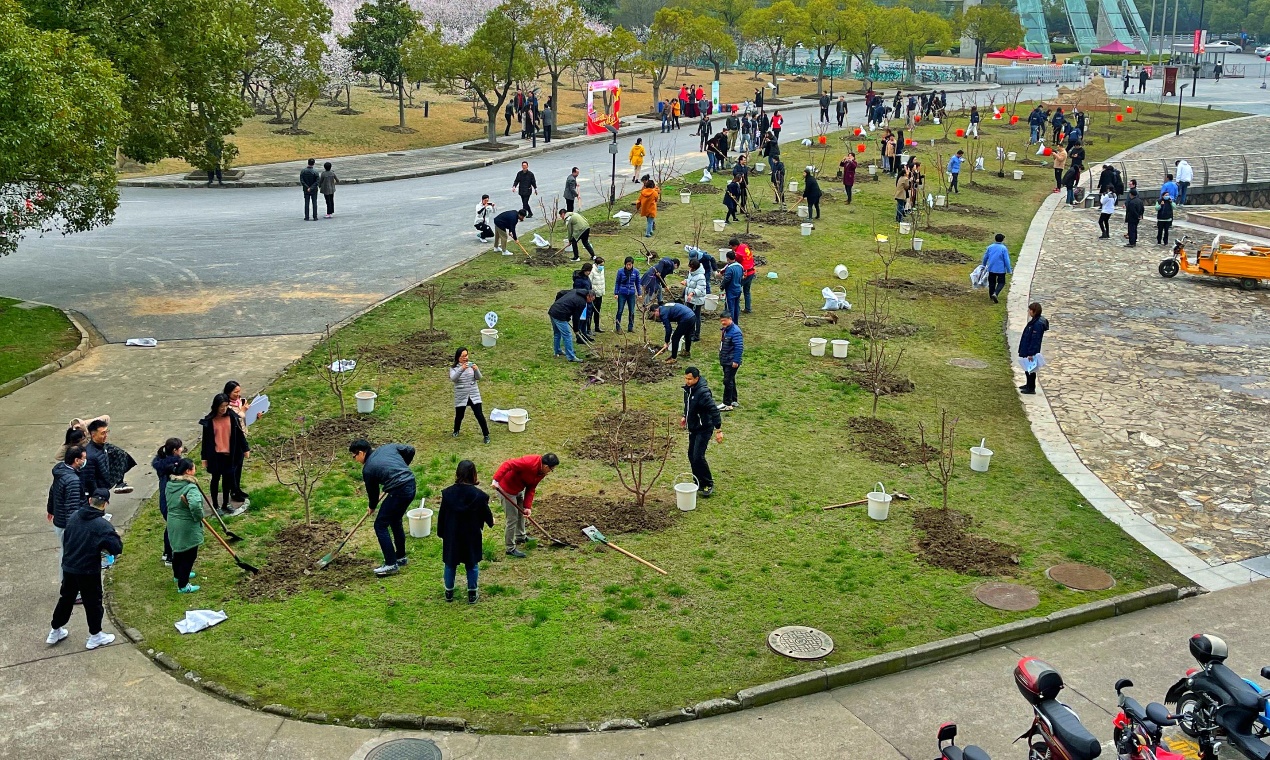 同植一片林,共启杏园春,在植树现场,和煦的阳光下,师生们多人一组,在专业植树人员的指导下,同劳动,齐协作,挥锹培土、扶苗浇水、填土压实……道道工序细致认真、有条不紊地将一株株幼苗种在春日的校园中。
