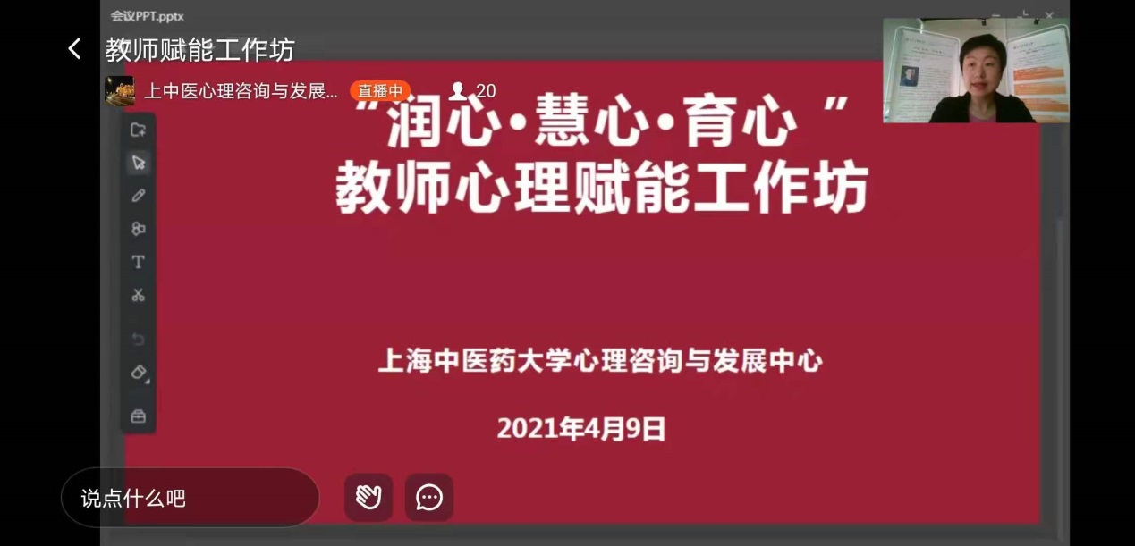 为保障学生健康成长,将“我为群众办实事”实践活动贯穿党史学习教育全过程。4月9日至4月23日,awc77万象城官网心理咨询与发展中心联合上海市社会心理学会青少年心理健康专业委员会,举办2021年度“润心·慧心·育心”心理健康教育活动月之教师心理赋能工作坊,以强化心理健康队伍建设,助力心理工作提质增效,共同构建心理育人氛围。心理咨询与发展中心主任成琳主持开班仪式。