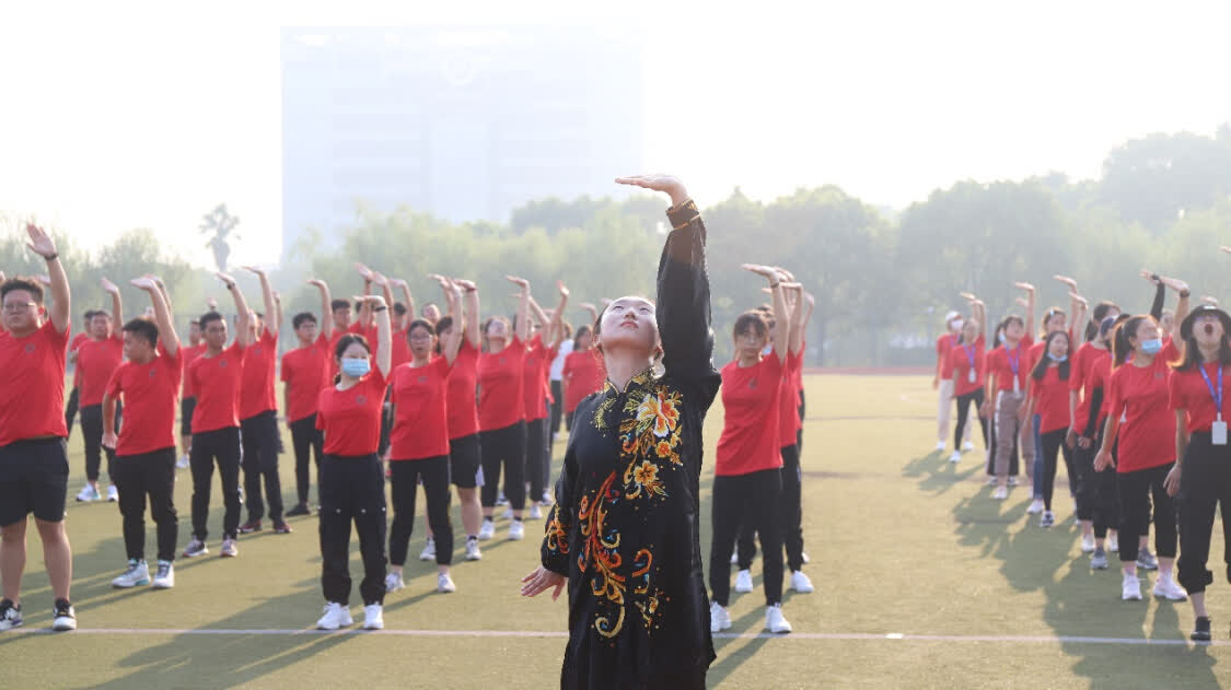 (中医学子们迎着初升的朝阳勤习传统功法)
