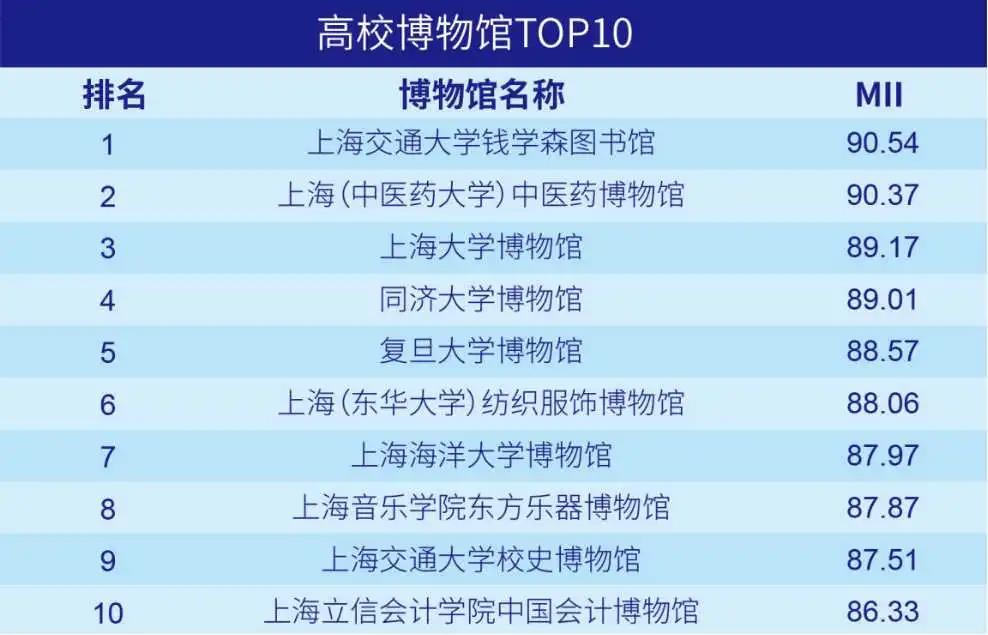 当天,市文旅局发布了2021年上海市博物馆社会影响力指数。在高校博物馆TOP10排行榜中,上海中医药博物馆以MII90.37名列第二。截至2020年底,本市已备案博物馆149家,本次评估按照指标体系、权重和算法,综合考虑博物馆对公众以及文化、社会与市场的综合影响力,主要是通过对“无意识沉淀”数据的采集和分析,具有较强的参考价值。