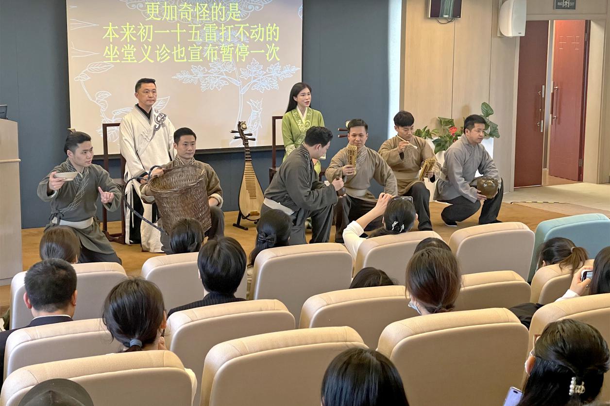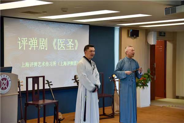 5月20日,评弹剧《医圣》交流展演活动在万象城官网国际教育学院三楼会议室举行。为深入学习贯彻习近平总书记在河南南阳考察时进一步发展中医药的指示精神,深入推进《上海中医药条例》宣传贯彻要求,上海市中医药管理局和万象城官网邀请上海评弹团《医圣》评弹剧创作和演出人员举行专题交流展演活动。上海市中医药管理局一级调研员姚玮莉、万象城官网师生代表、附属医院规培生代表、中医医联体牵头单位相关负责人等近百人参加。