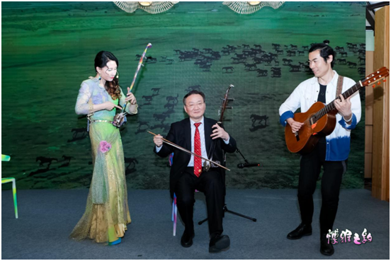 活动现场上,艺术家携手为师生带来海派沙龙雅集《两弦间的宇宙》。二胡独奏《春江花月夜》、吉他二胡合奏《一步之遥》、诗乐演奏《忆江南》、经典曲目赏析等节目以独树一帜的惊艳演绎、浓烈的海派情愫及沉浸式的艺术体验,引领学生感受中国文化创新的艺术、穿越海派的风情与中国千年文化的回想。马晓辉、徐建光与音乐制作人陈功合奏乐曲《草原赛马》,更是透过美妙的旋律和多元文化的融合,呈现了音乐艺术的张力,赢得在场师生的阵阵掌声。