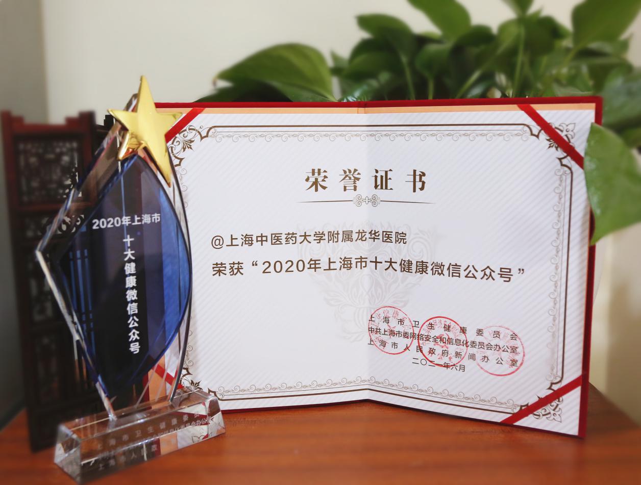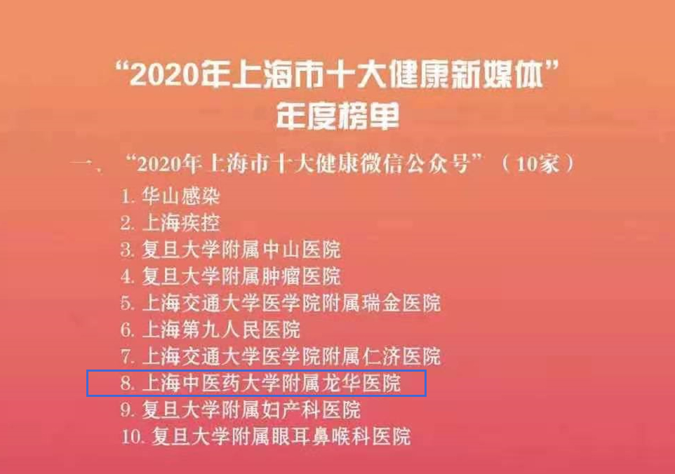 6月18日,上海市卫生健康委、市委网信办、市政府新闻办联合开展的“2020年上海市十大健康新媒体”推选活动获奖名单出炉,附属龙华医院荣获“2020年上海市十大健康微信公众号”,也是唯一入选的中医医院健康微信公众号。