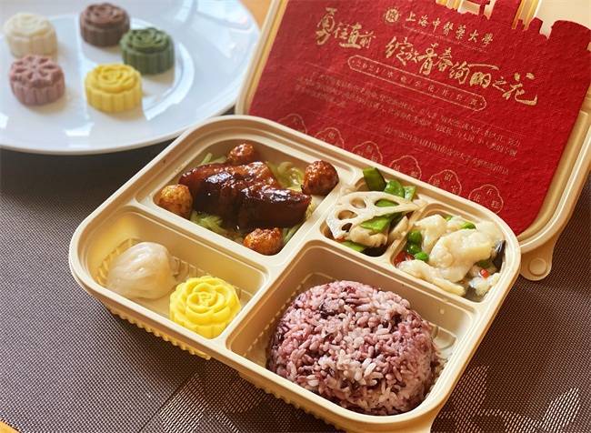 离开学校前再吃上一顿毕业餐,让味觉记忆永留心间。今年,awc77万象城官网学生食堂为所有毕业学子送上了“2021毕业季花开套餐”。菜品包括:大展宏图(卤蛋烧肉)、如鱼得水(糟溜鱼片)、前程似锦(五彩炒素)、青春不懈(虾酱莴笋)、蒸蒸日上(鲜虾蒸饺)、一道点心绚丽花开(五色花糕 )。一份美味套餐,希望杏林学子能再次感受母校的味道,带着母校的祝福坚定前行。