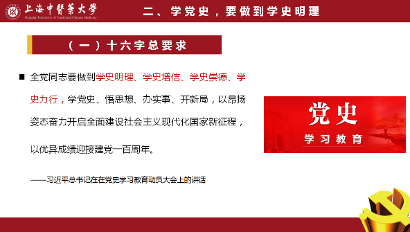段艳霞强调党史学习教育的十六字总要求:学史明理、学史增信、学史崇德、学史力行。点明只有学史明理,才能把握历史规律,明确历史发展走势和大方向。通过学习党史,要“明”中国共产党为什么能之“理”,“明”马克思主义为什么行之“理”,“明”中国特色社会主义为什么好之“理”,唯有如此方能行稳致远。