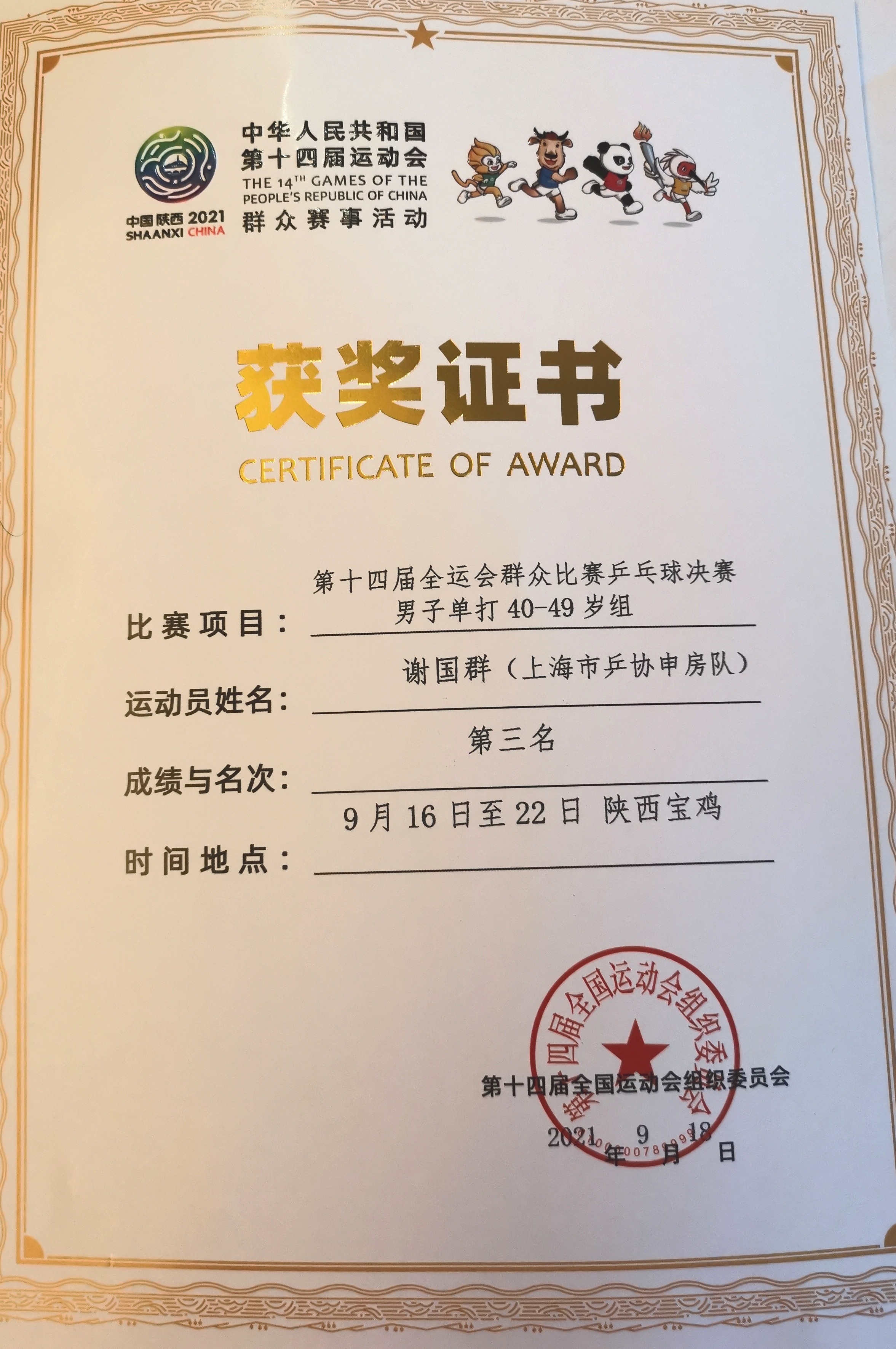 9月22日,在第十四届全运会群众赛事活动乒乓球比赛中,万象城官网公共健康学院副院长谢国群作为上海代表队的一员,奋力拼搏,发挥出色,夺得40-49岁组男子单打比赛铜牌。上海市体育局赵光圣巡视员观摩了比赛,对谢国群的获奖表示祝贺。
