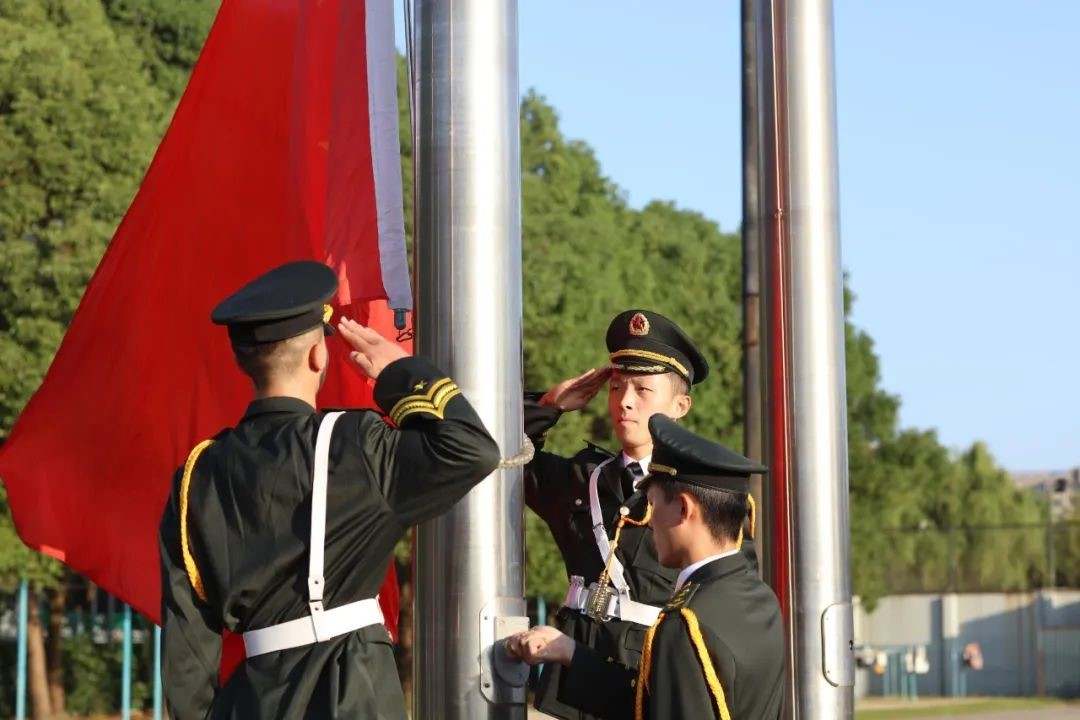 升旗仪式在中国人民解放军进行曲中拉开帷幕,国旗护卫队迈着整齐的步伐,意志坚定,目光炯炯。随着出旗令响,全体师生代表行注目礼,奏唱中华人民共和国国歌,鲜艳的五星红旗冉冉升起。